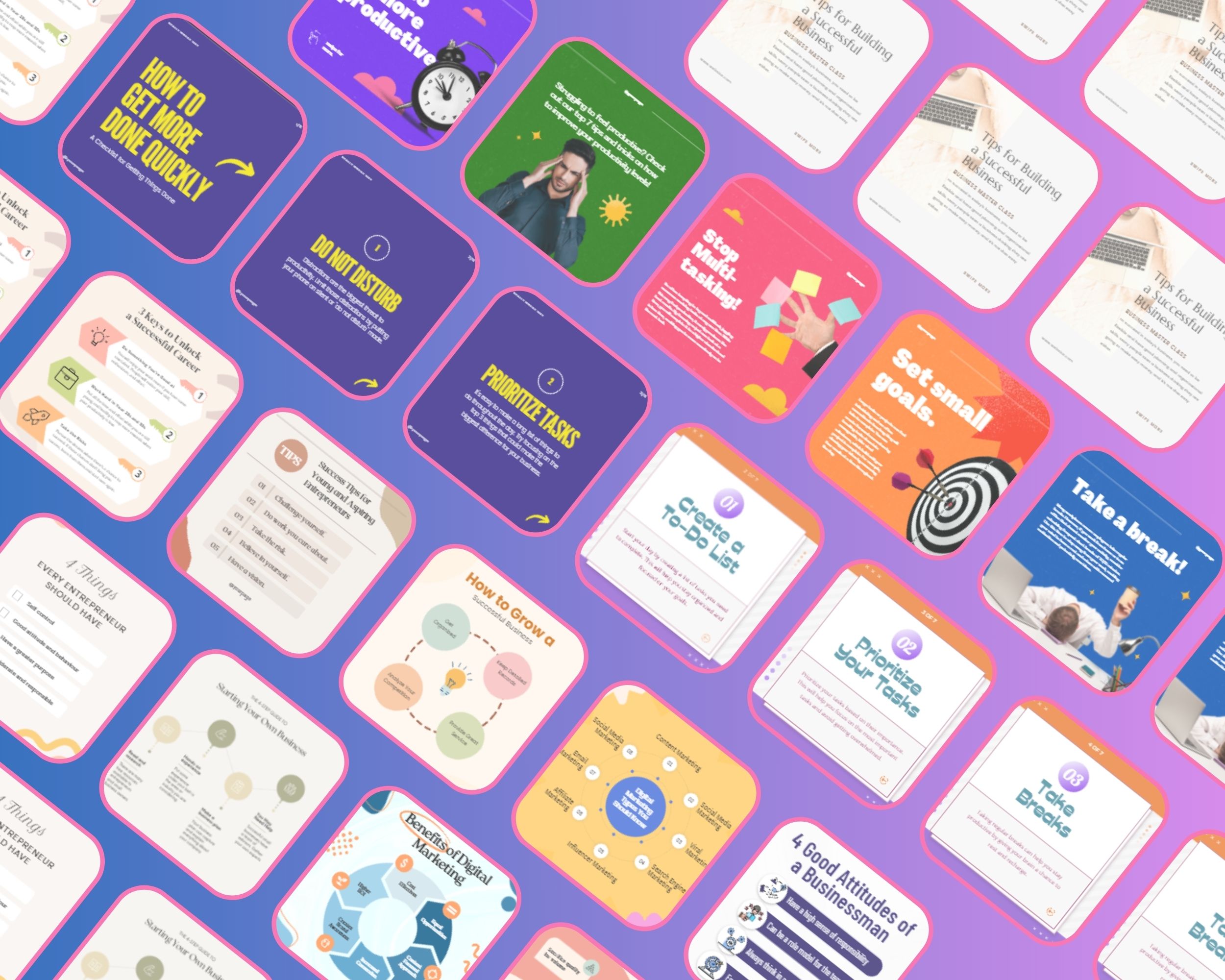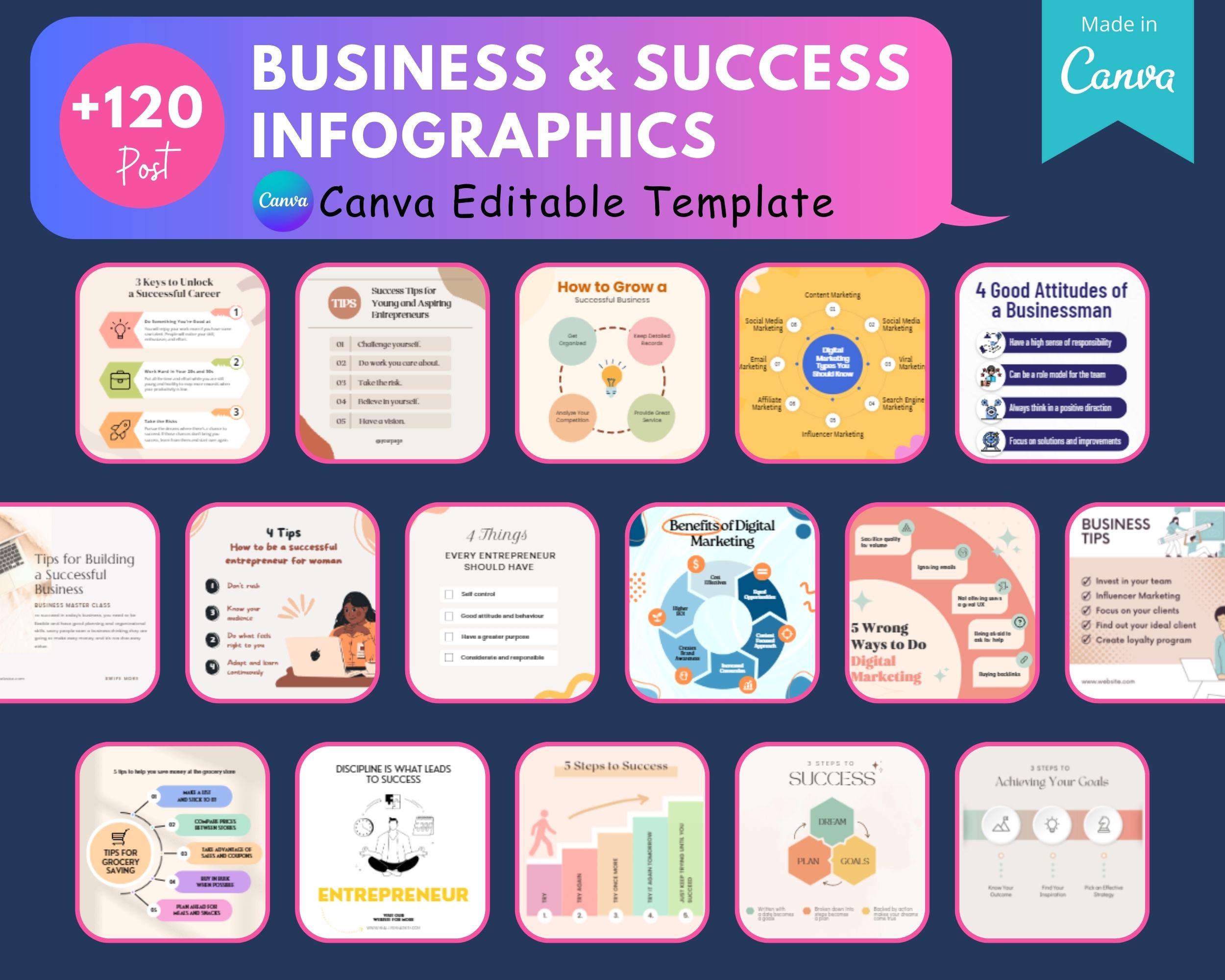 Business & Success Infographics For Entrepreneurs, Productivity Posts, Motivational & Self-care Quotes - Canva Editable Templates